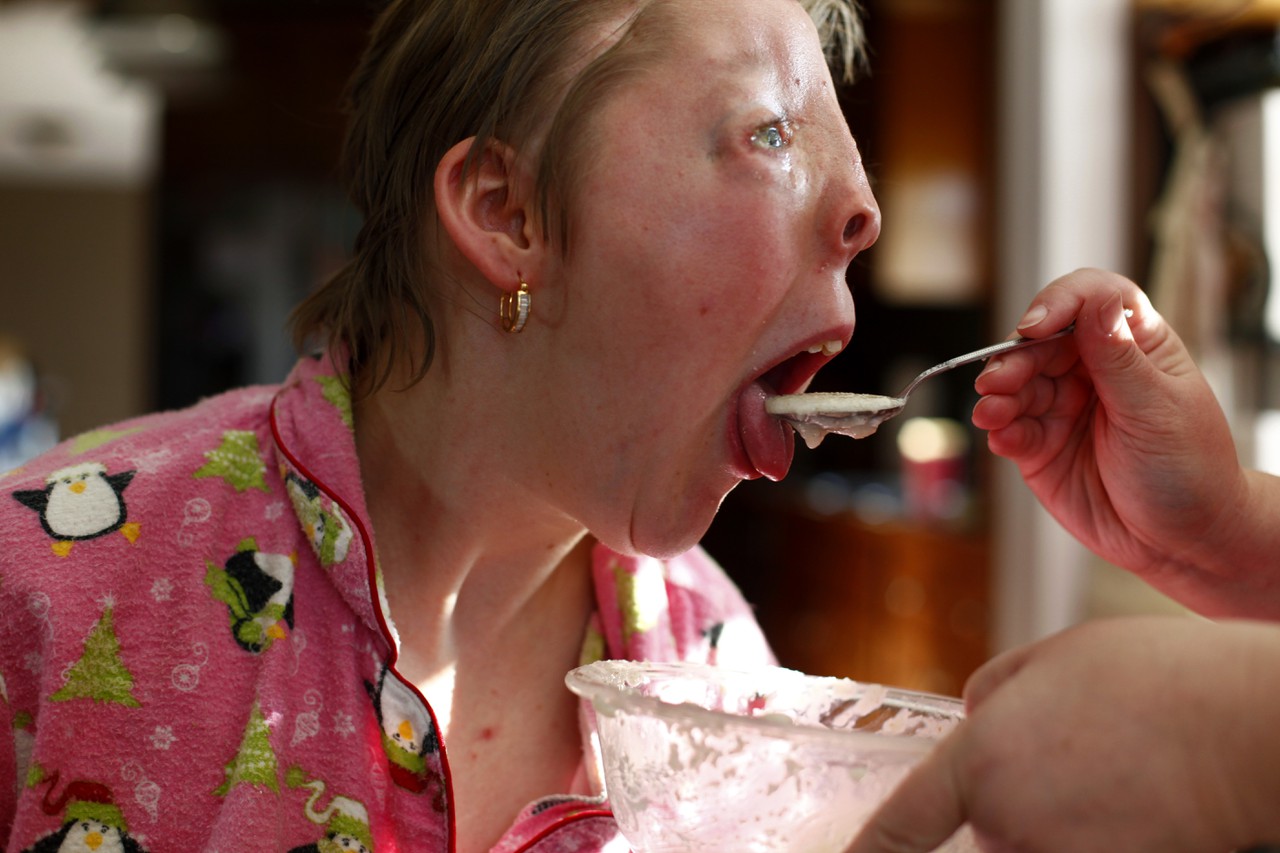 Jessica was born with a syndrome called cerebro-oculo-nasal hydrocephalus, which causes malformations in the eyes, nose and brain. Where most have a nose, Jessica developed a crevice. Her brain growth was stunted as well, due to un-drained spinal fluid.