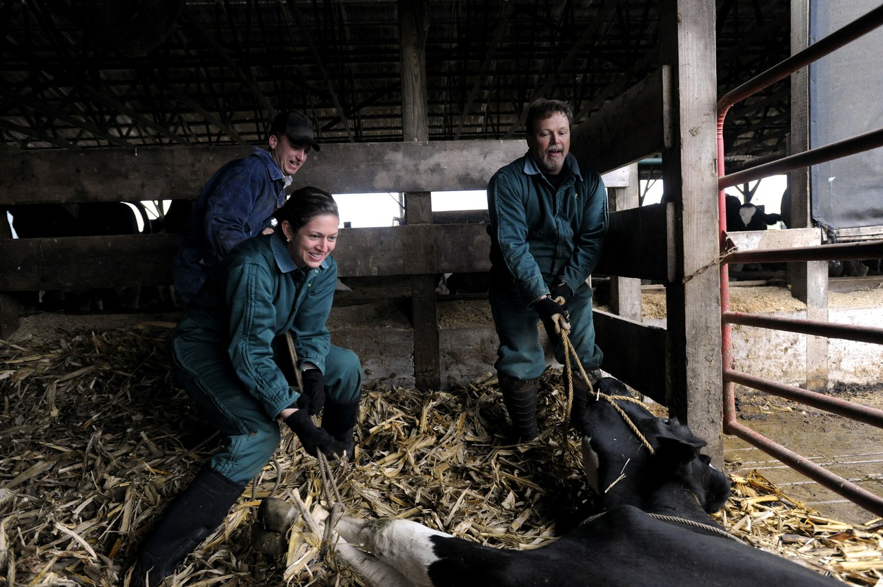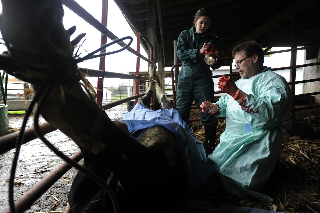 Bruce is trying to save a valuable Holstein dairy cow suffering from a rare, twisted stomach.