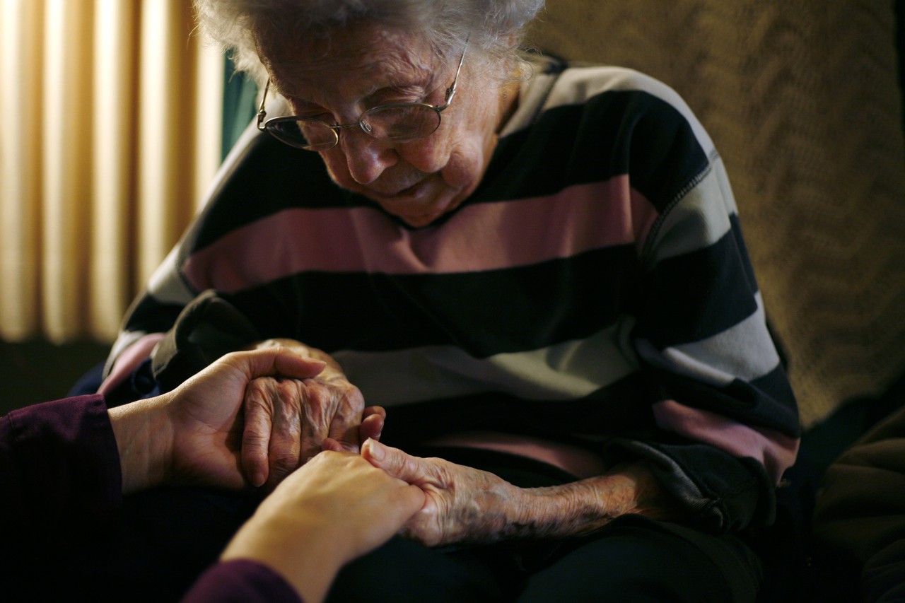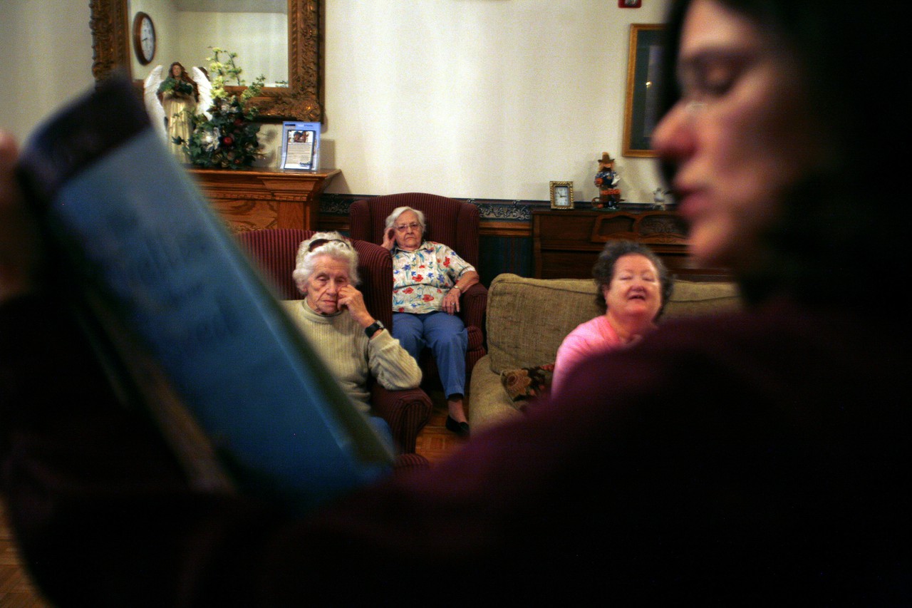 Marlina Coomer pauses in front of each of the nine women in the dimly lit parlor at Crestview Assisted Living. Some lean forward, allowing Marlina to get both arms around their thin, stooped shoulders. Others sit slumped, waiting for a lighter touch on their backs. Light and dark hair mixes as each woman leans her heads on Marlina’s shoulders.