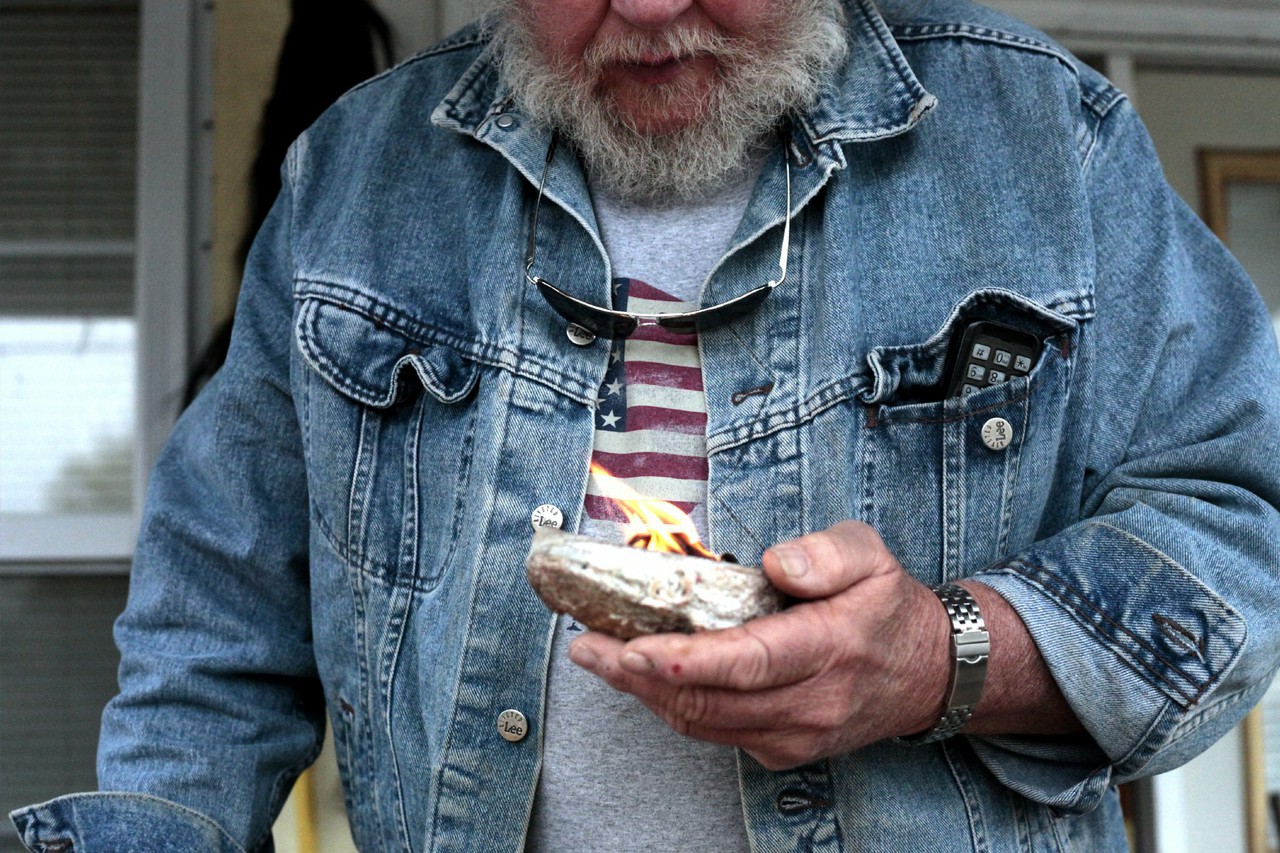 “I cannot make a job out of these drums,” says Wallace, running the ring through the smoke of burning sage to purify it. The drums aren’t for sale and are given freely or traded to those who need them for ceremonies. Wallace walks the Red Road, a Lakota spiritual tradition that teaches walking the right road in life.