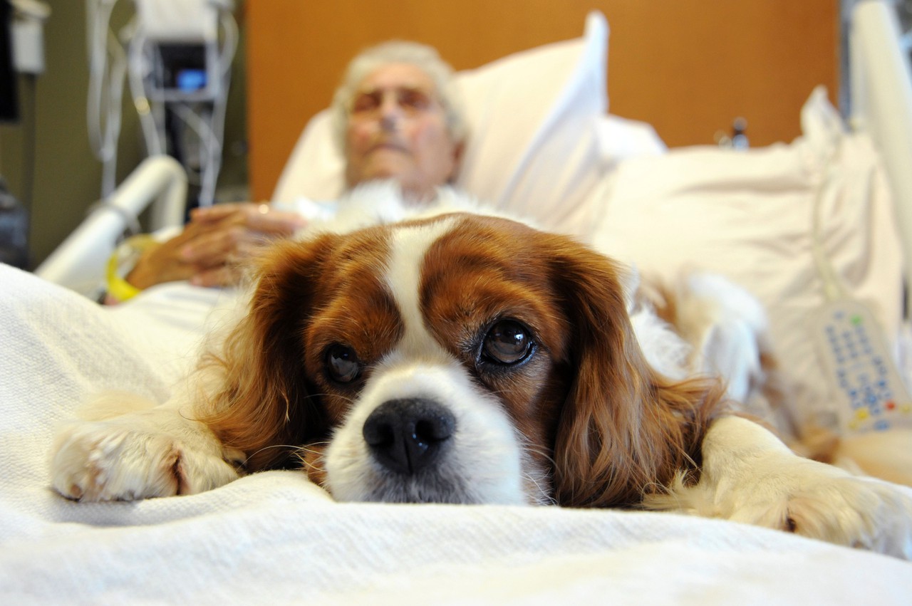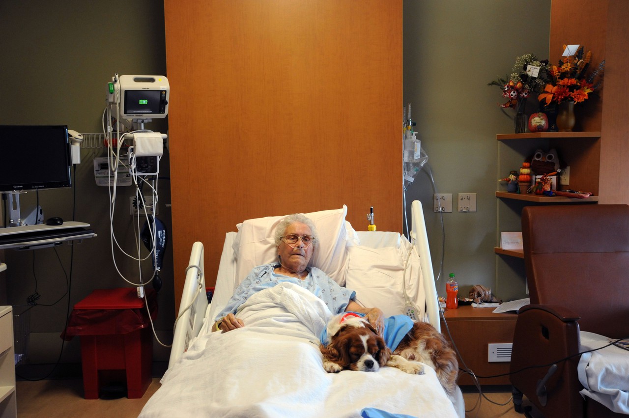 In hospitals, Ben wears a doctor costume and cuddles right up to elderly patients, their weathered fingers combing through his fur as they recount memories of their own pets.