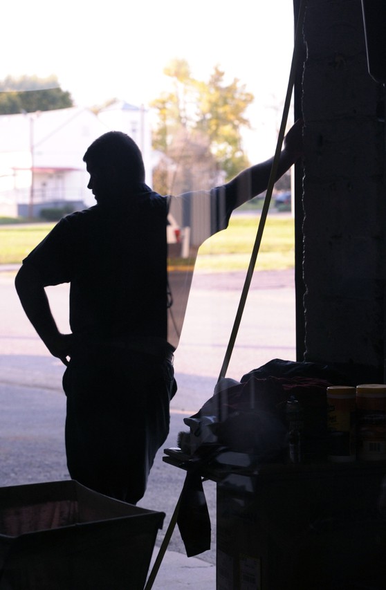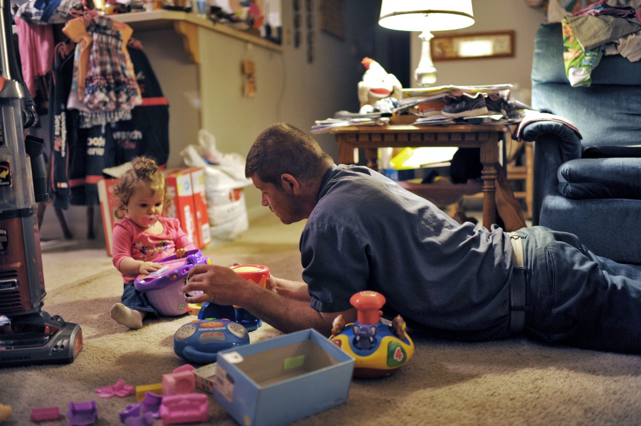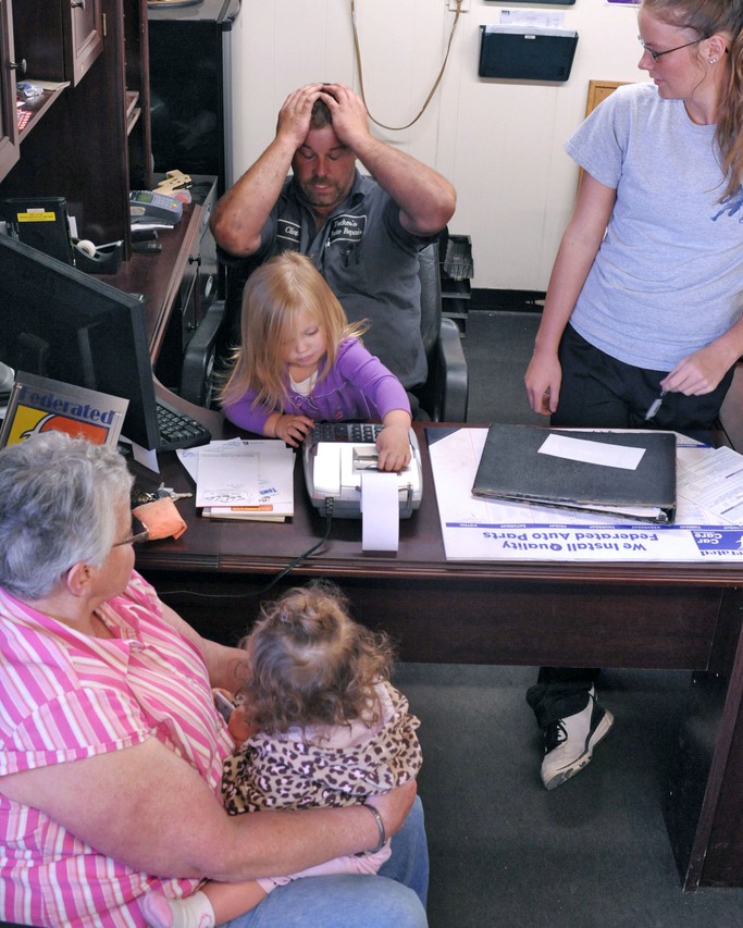 Behind this man stands a village: a cast of family and friends who support and help him succeed. Clint’s father and his stepdaughter help out in the auto shop, a place where work is taken seriously, yet is punctuated by the girls’ arrival. They transport this masculine, greasy environment into a space littered with toys and filled with giggles.