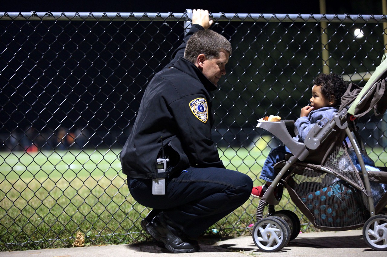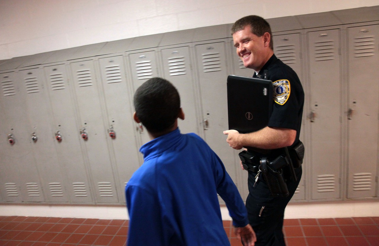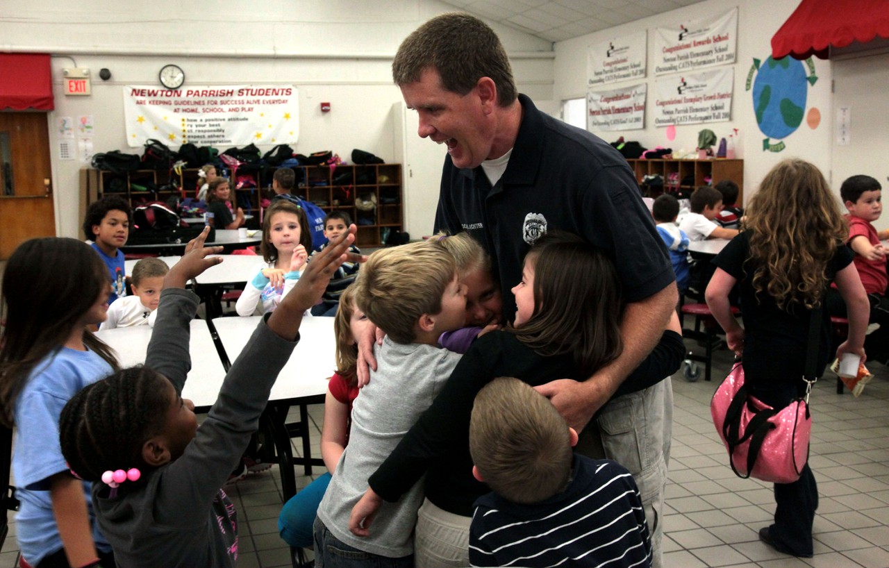 “I think you’re doing a good job of teaching kids safety,” Terrance Meyer, 7, tells Officer Sean during an after-school visit to Newton Parrish Elementary.