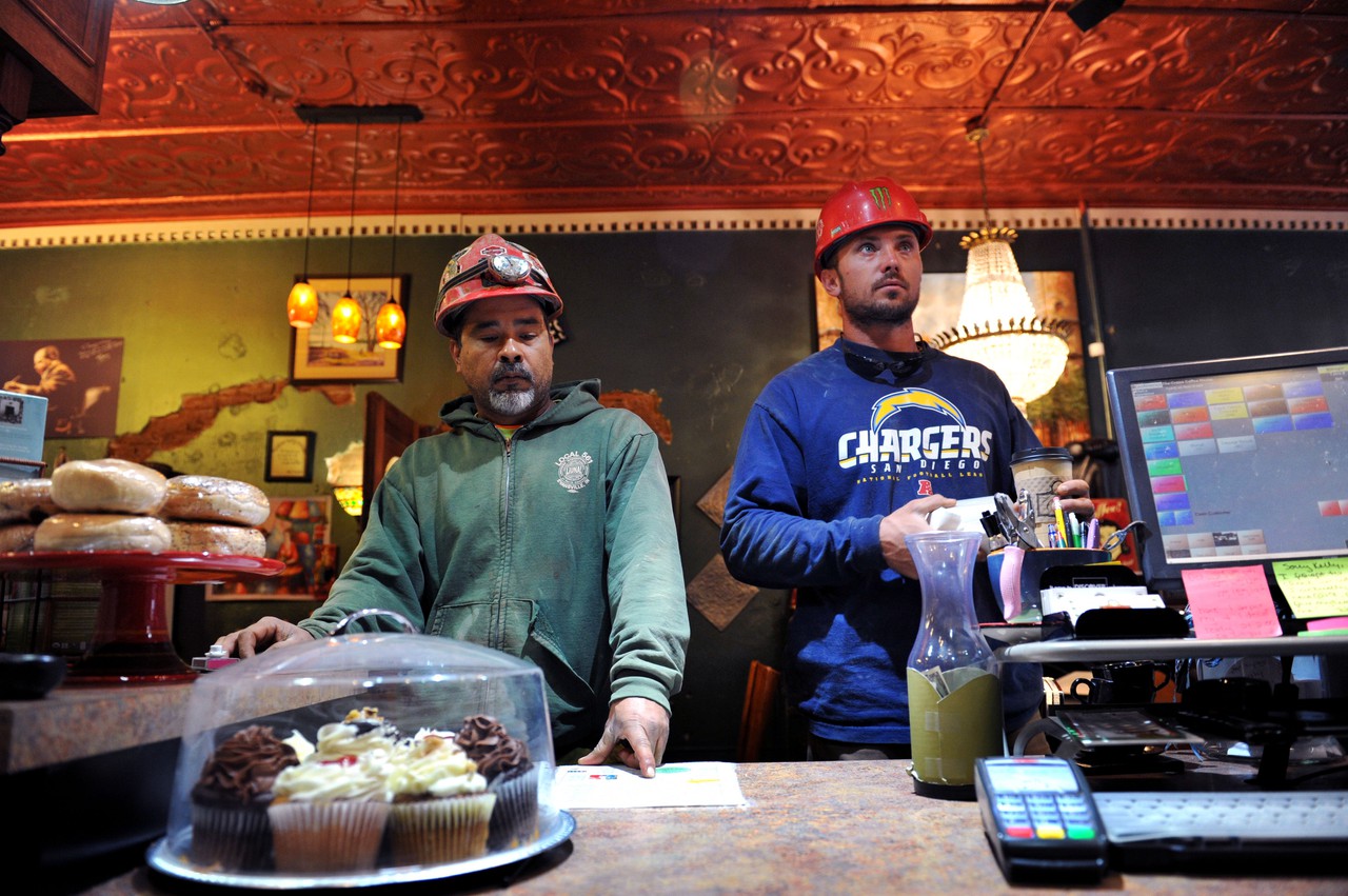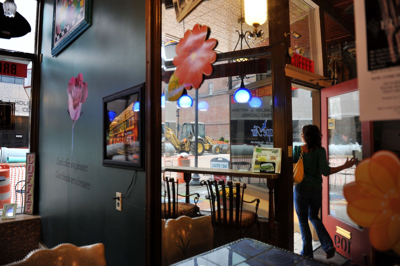 Through the storefront window, construction trucks helping to revitalize downtown fill the frame, in contrast to the eclectic décor of chandeliers, art, and antiques that surrounds customers.
