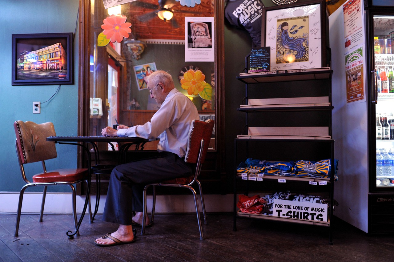 An older man completes his crossword puzzle, a mother helps her son with his homework, two teenage girls laugh and a young couple plays cards. The Crème is a central gathering place for all.