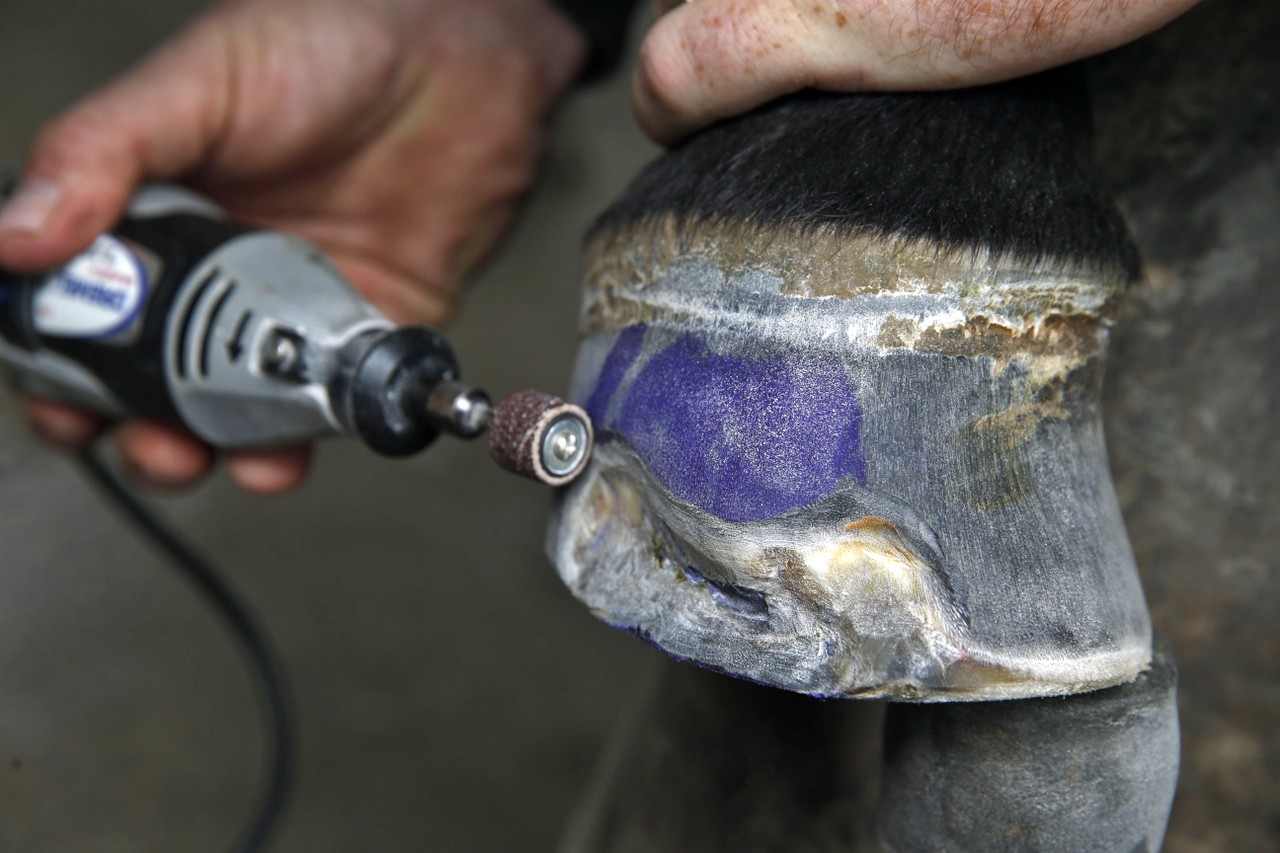 Dr. Bryan Fraley slides the switch on a Dremel tool and sands the exterior of a horse’s hoof afflicted with a fungal infection. The high-pitched whine of the motor doesn’t bother the horse, which had been injected with a sedative.