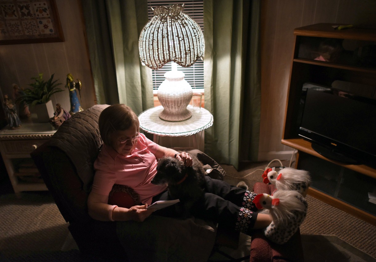 A pair of furry chicken slippers shine in the light of a single lamp on the feet of Virginia Hensley as she reads her daily Bible verses before bed.
