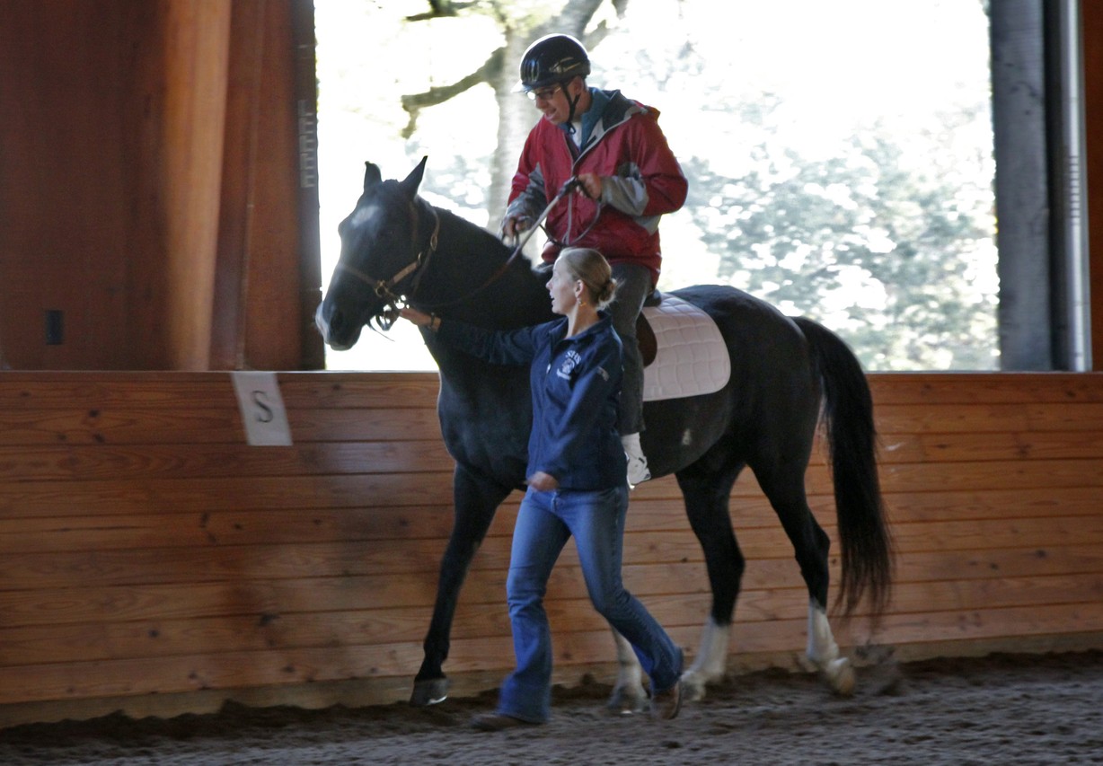 His legs tremble as Big Boy begins to walk. Betsy Grewe, director of the Stewart Home School equine program, sees Tim’s fear and touches his leg.