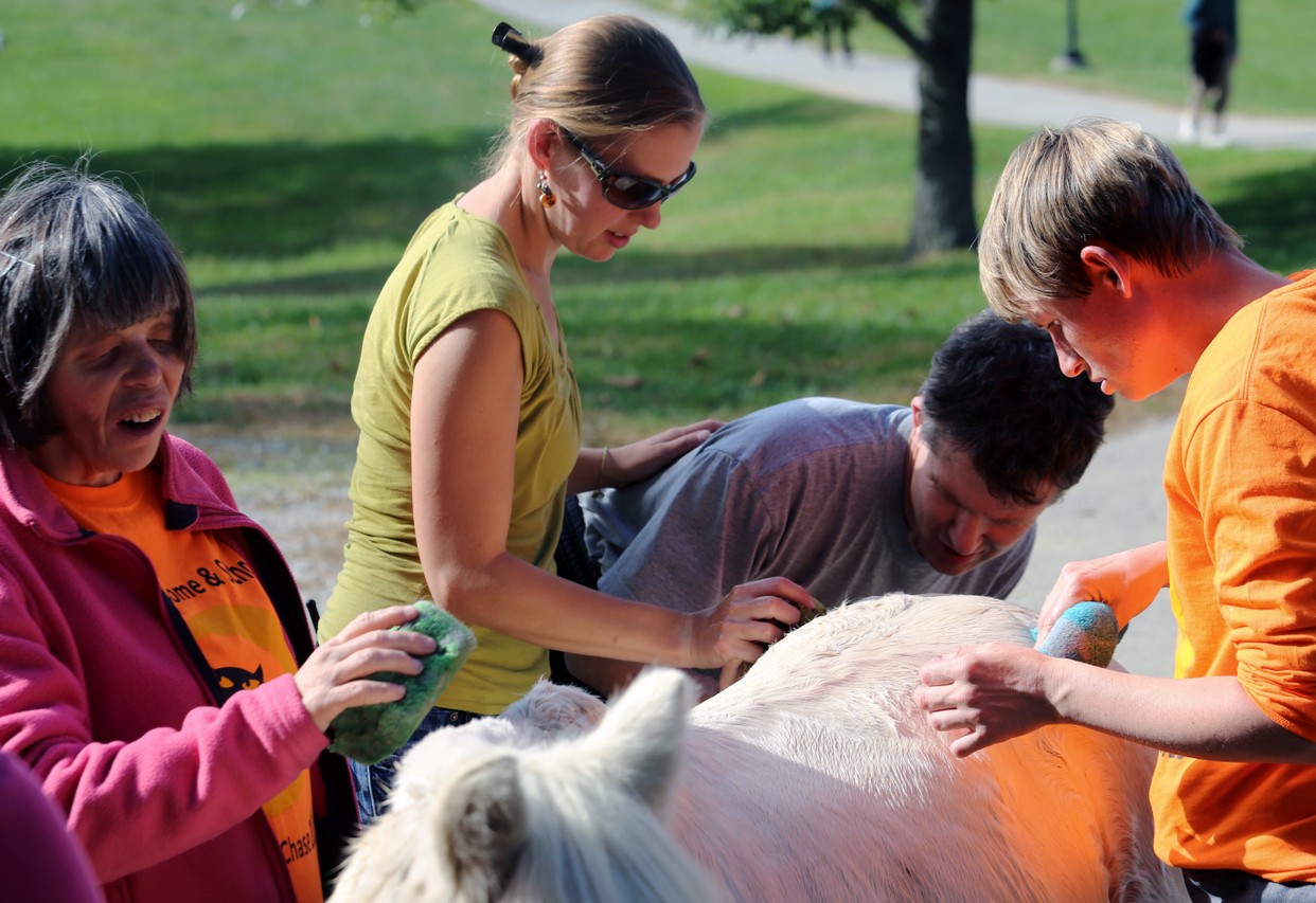 Betsy and Jessica Hagan, assistant director, teach grooming and brushing, saddling, riding and horse-drawn cart handling, and verbally guided physical therapy to benefit muscle coordination and strengthening. Beyond the chance to engage with big, beautiful horses, the students make noticeable gains in self-confidence and esteem, Betsy says.