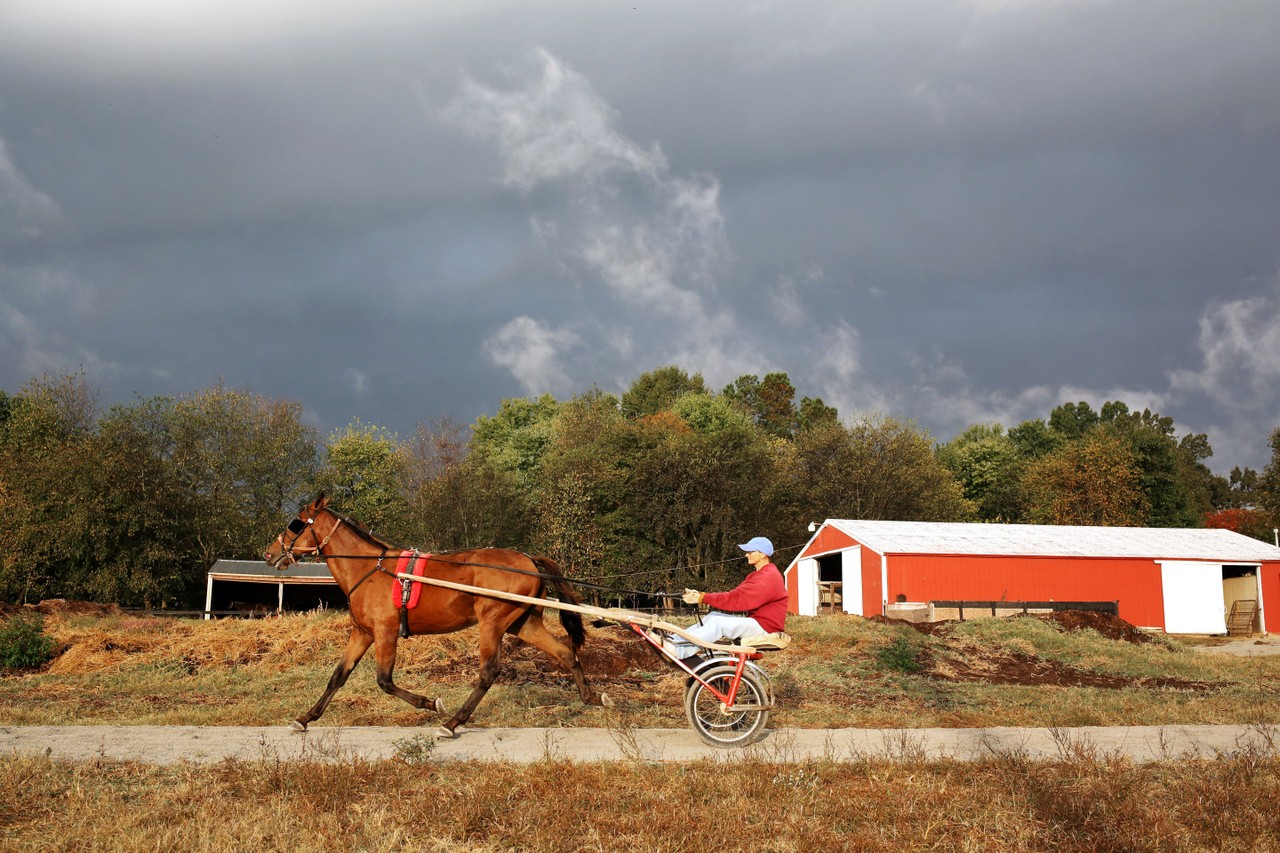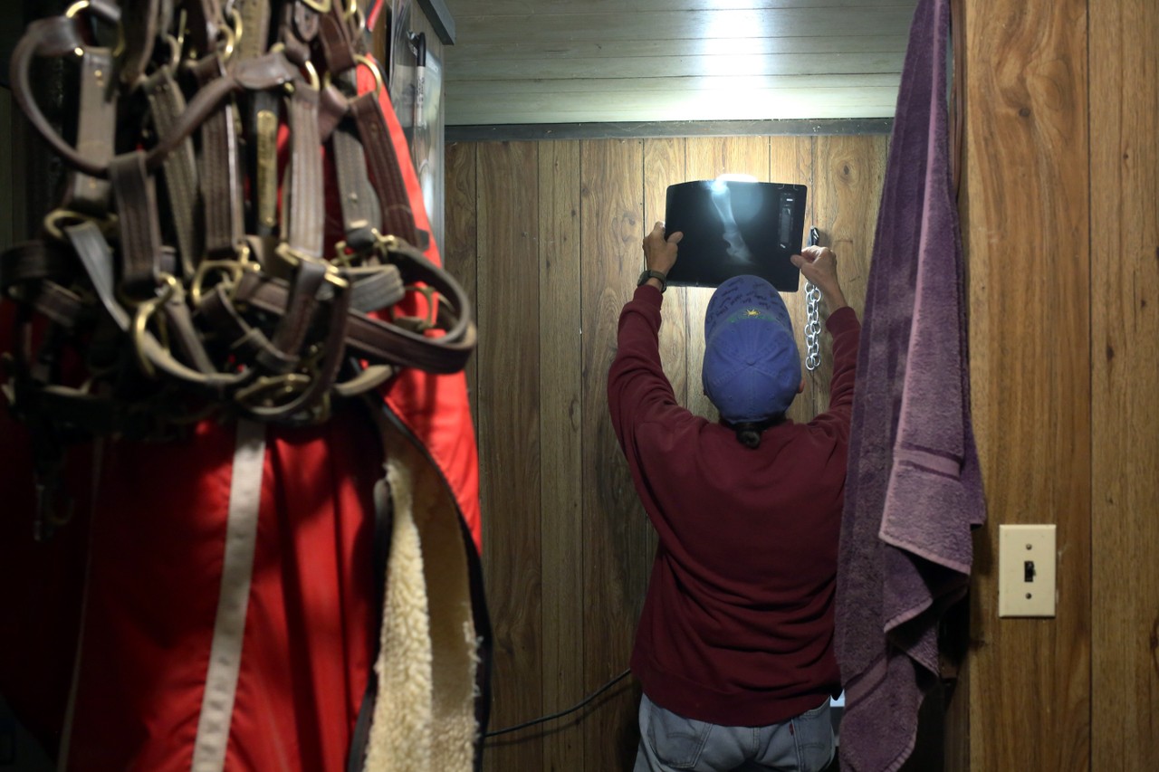 Horse veterinarian Bambi Fox sits at a flickering computer screen and exhales a short breath as she turns her head to the window. In the closet hang her husband’s clothes, and on the walls are red and blue horse racing ribbons and a temperature gauge that says, “All I pay my psychiatrist is the cost of feed and hay … and he’ll listen to me any day.”