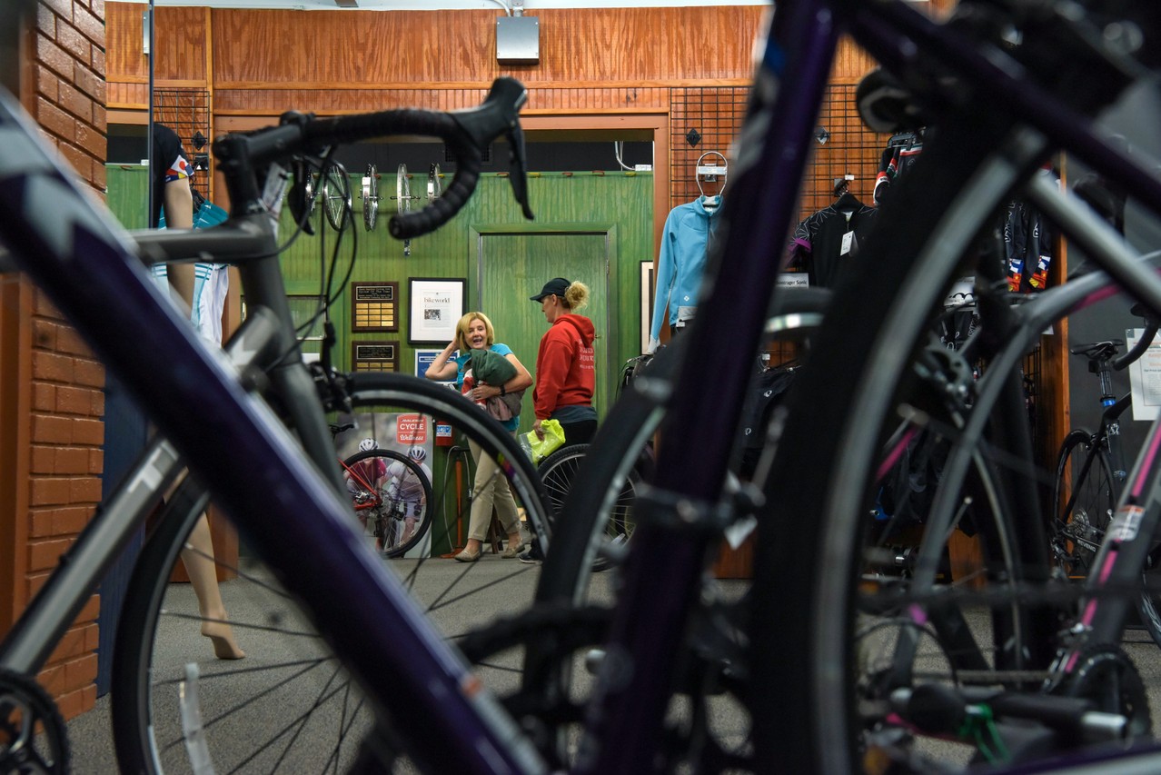 The front door swings open and a bell chimes through the store announcing that a customer has walked in. Beyond the rows of shiny new bicycles and the bells and whistles for them, a small voice comes from a bright green office tucked away in the back.