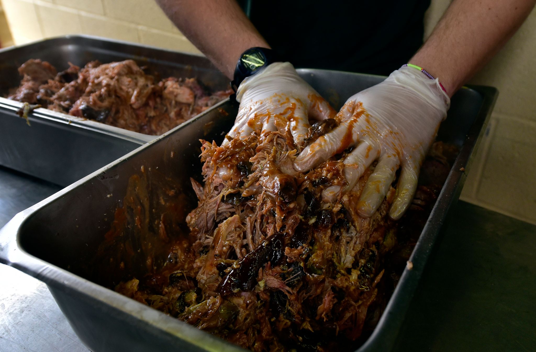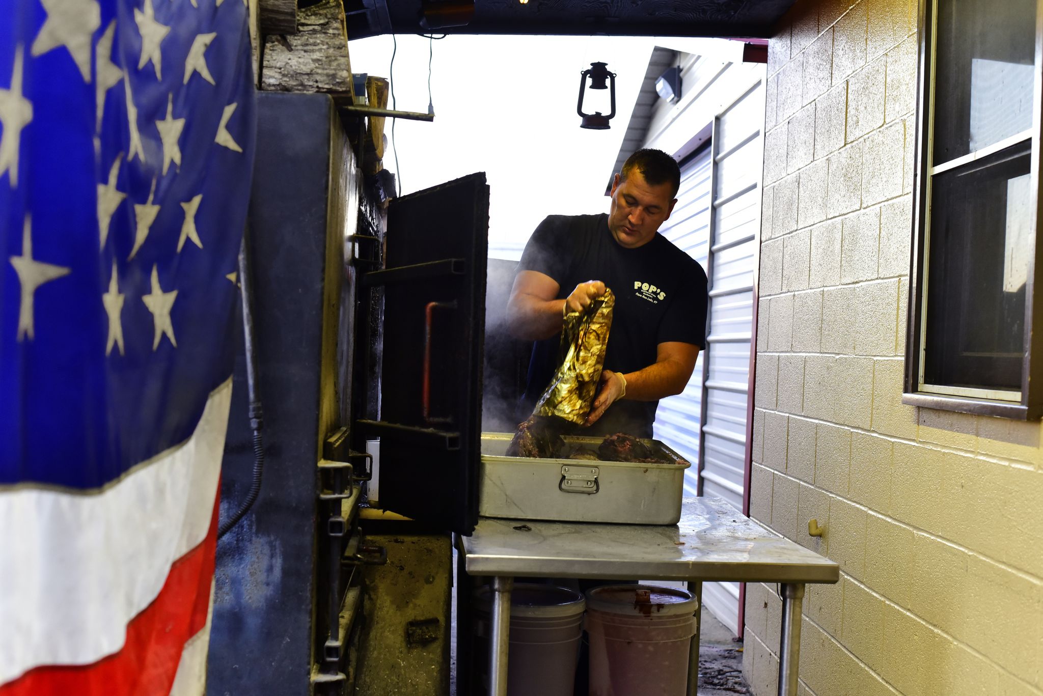 Ash escapes from the smoker as Adam Ferguson opens a small metal door to add wood to the fire that will cook barbecue, brisket, and ribs until the meat falls of the bones. The meats cook for up to 22 hours a day, some wrapped in foil to hold in flavor while others cook on the open grill.