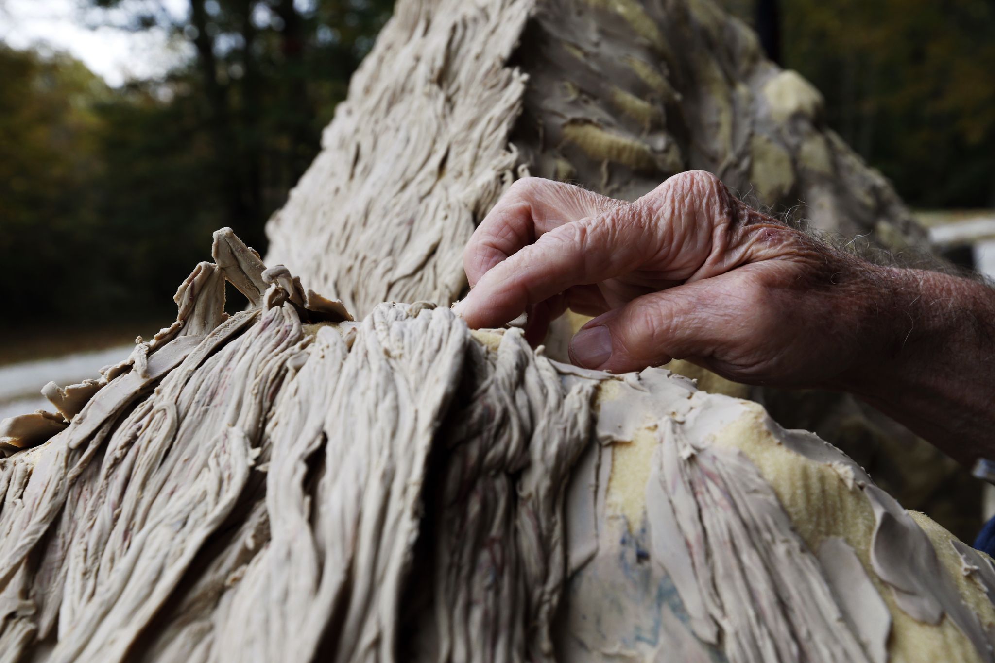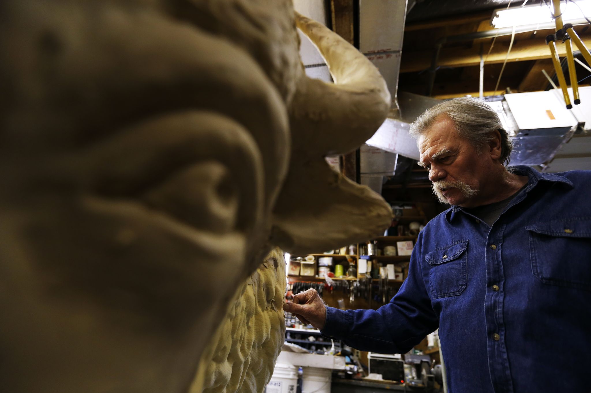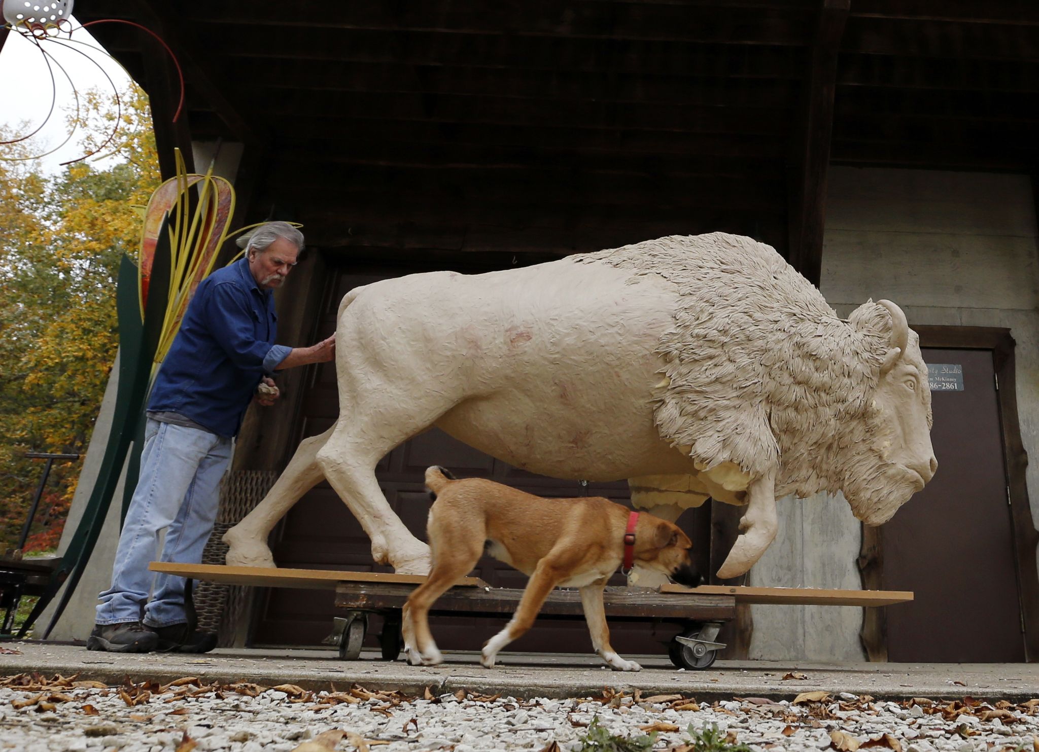 Sam McKinney uses a machete to scrape small pieces of glycerin-based modeling clay textured to look like the tufts of hair on an American bison. A 5-foot-tall foam likeness of the animal – about the size of a female – stands on a wheeled platform in the middle of his workshop. He will press each freshly formed piece of hair, filling in holes in the beast’s mane.