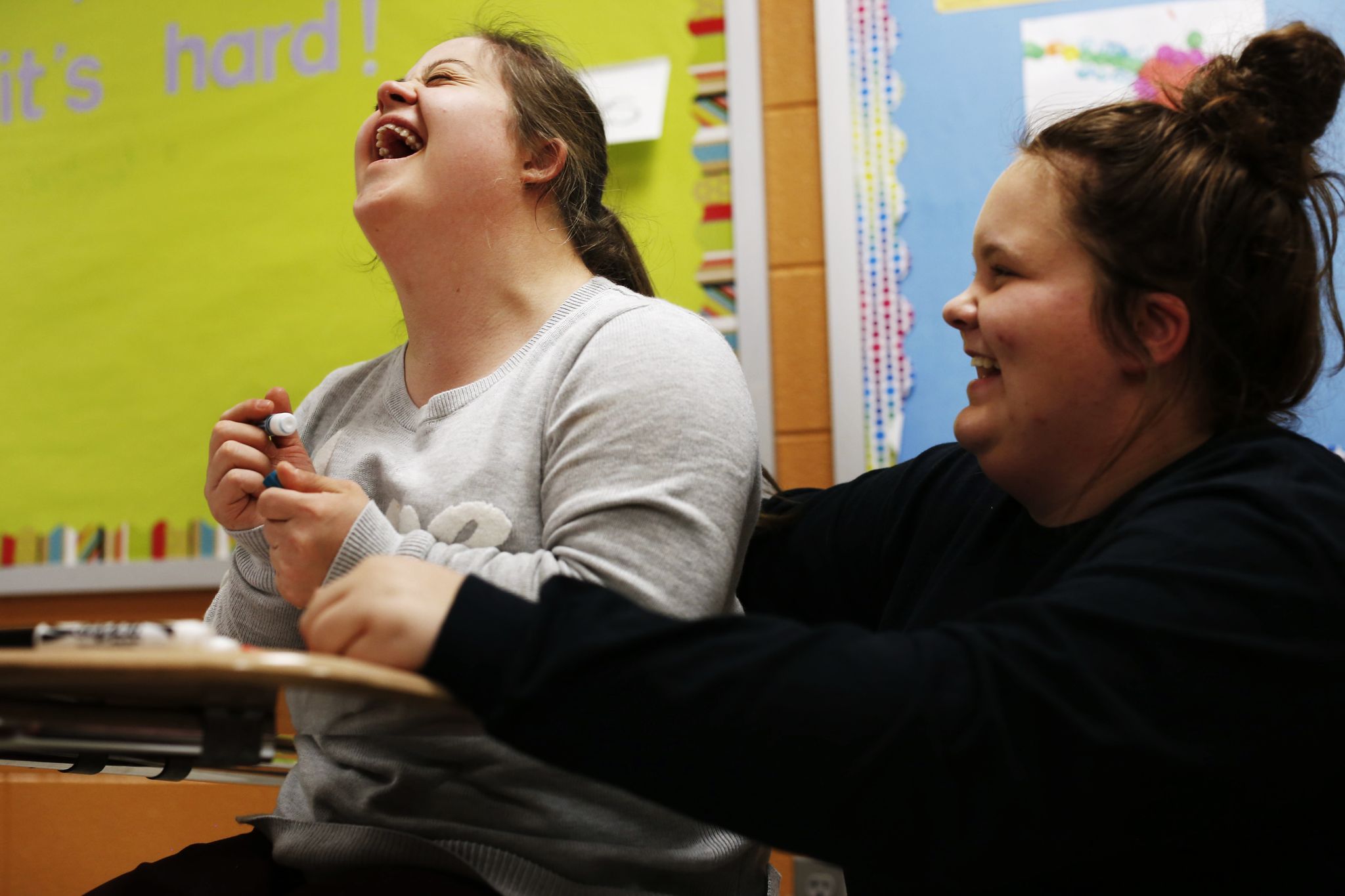 One buddy Zoe sees daily is Abby Caudill, a peer tutor for special education kids. A 16-year-old junior, Abby helps Zoe with math, writing and whatever she needs. “If I’m having a bad day,” Abby says, “I look forward to seeing her.”