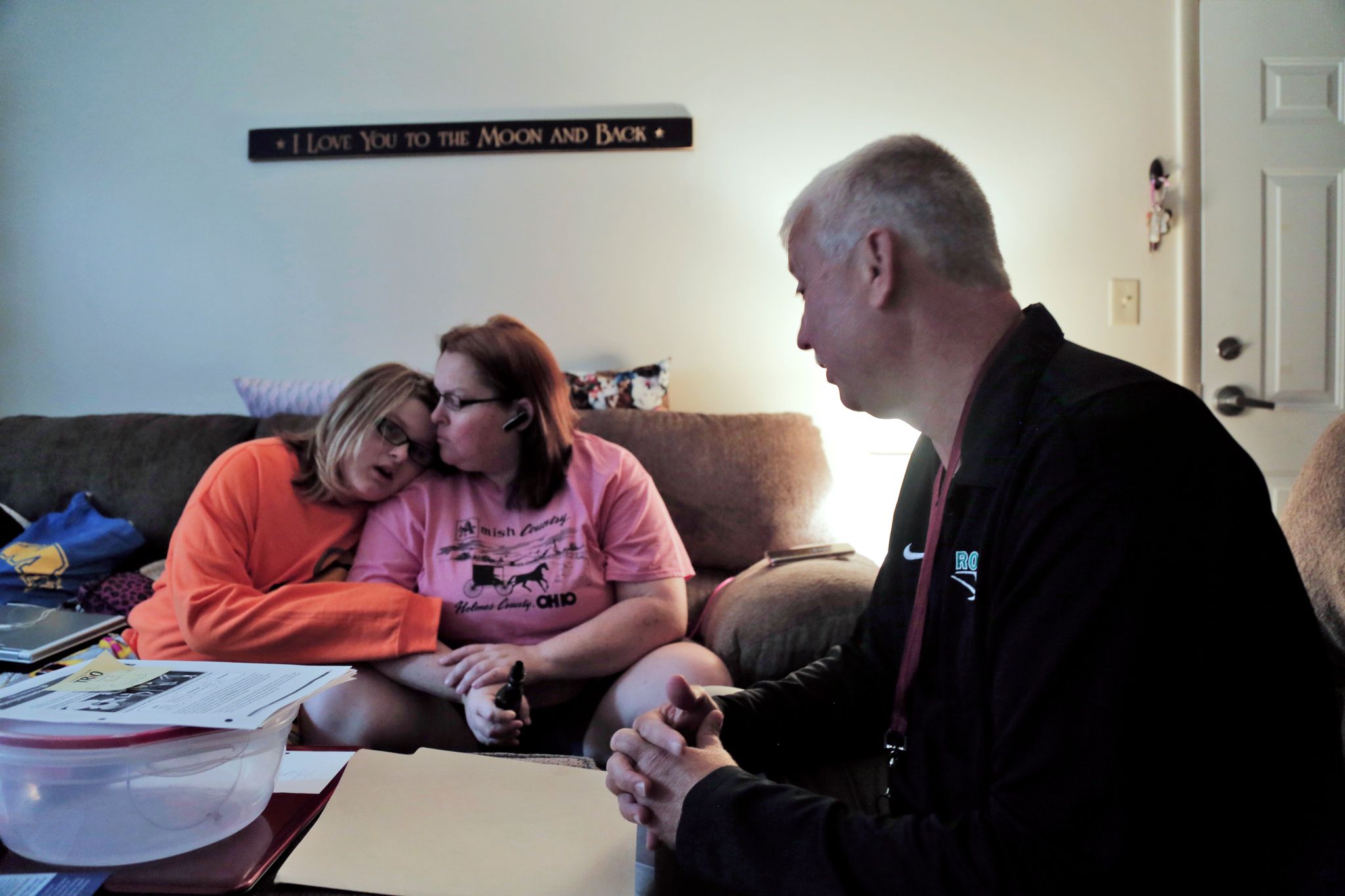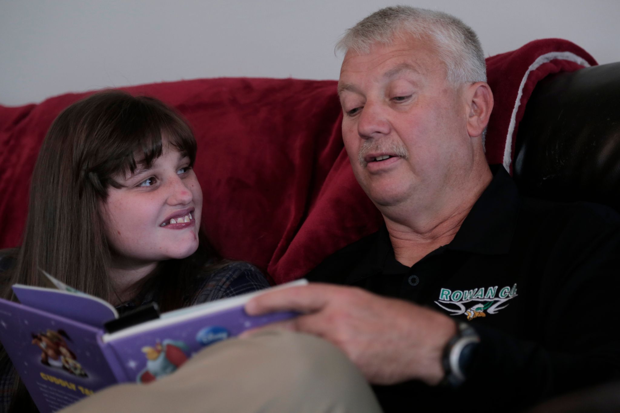 Makenna Riddle’s mom Mary Ann opens the front door and leads Shawn Thacker into the house. Coach is here, and he’s going to read one of Makenna’s favorite books, “Trolls.”
