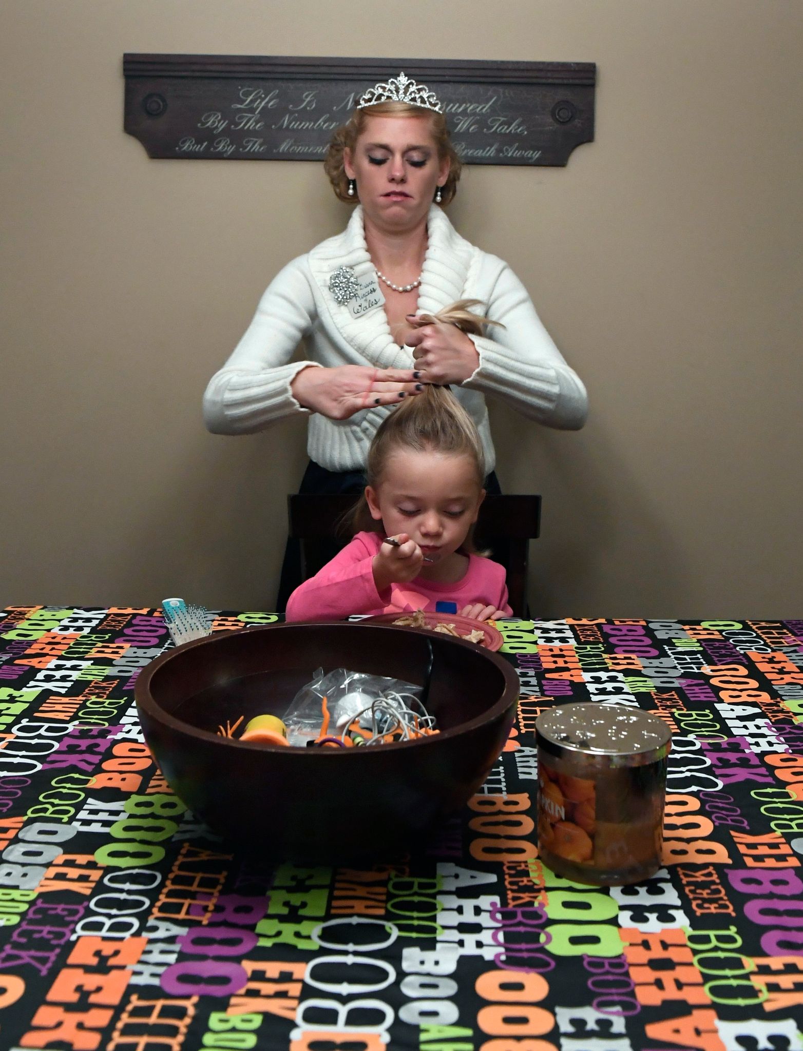 This morning she is transforming herself into Princess Diana. It’s part of her celebration of Halloween as an influential historical figure for her eighth grade social studies classes at Rowan County Middle School. Soon her husband, James, and their children, Harper, 4, and Haddie, 18 months, will awaken, and Kristen and James will begin to orbit their child-centered universe.