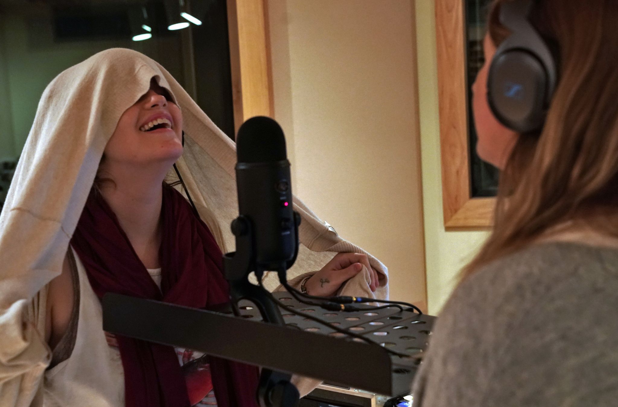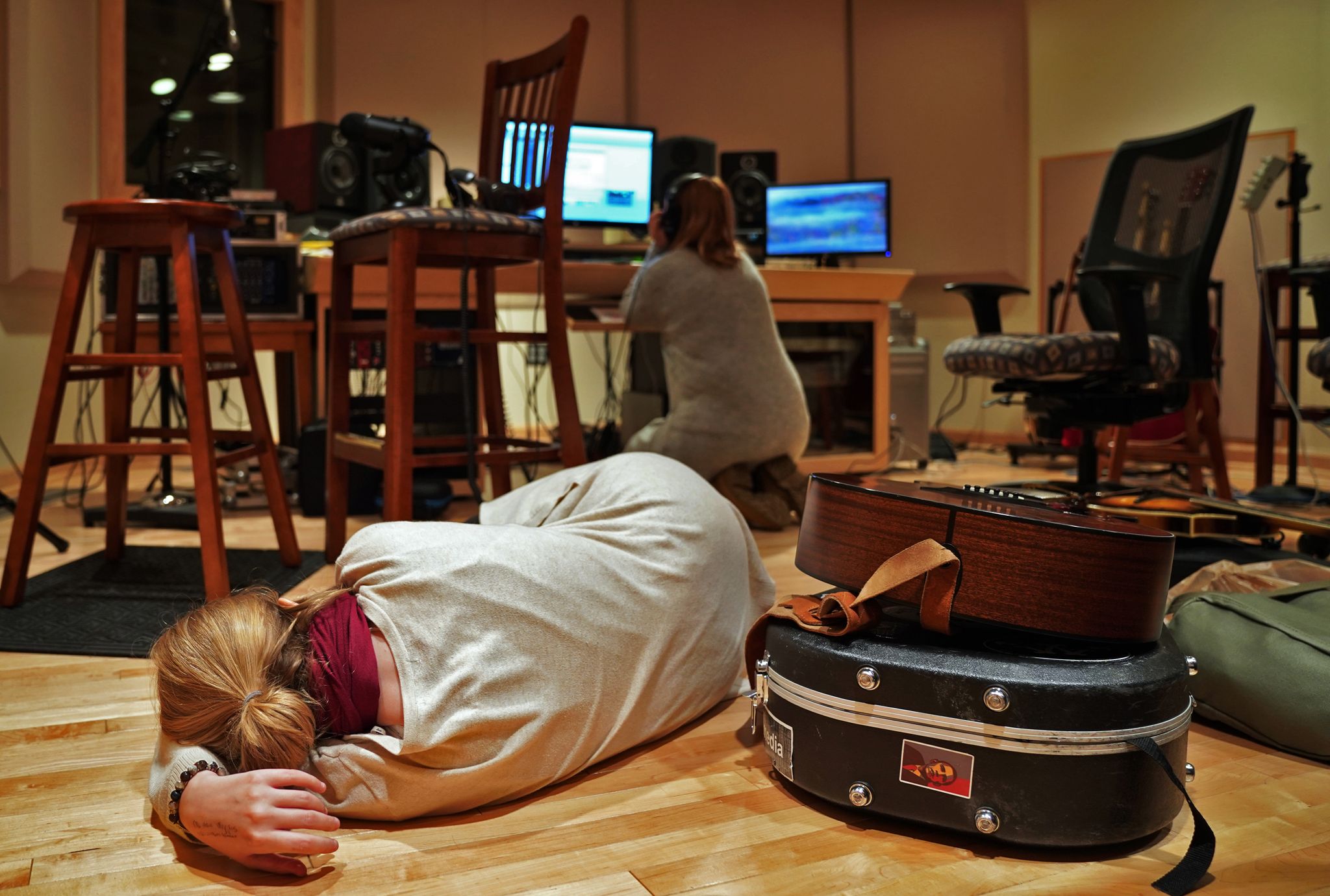 In the studio, Caroline prepares for recording while Elizabeth strums the guitar. A few practice runs later and Elizabeth has nailed down a guitar track. They slide on headphones, plug in the microphone and begin creating a new piece for their first album. From the initial rough lyrics to the final polished piece, they have worked with little outside influence.