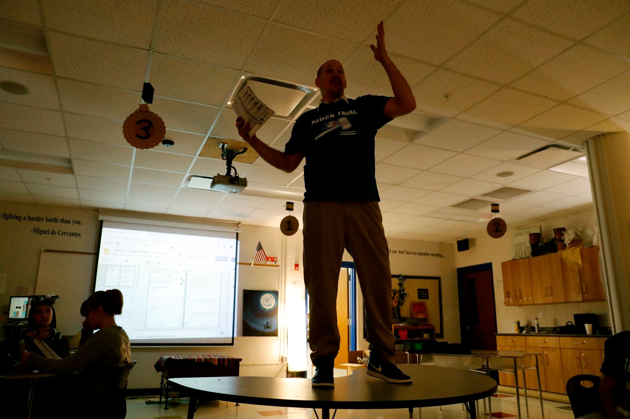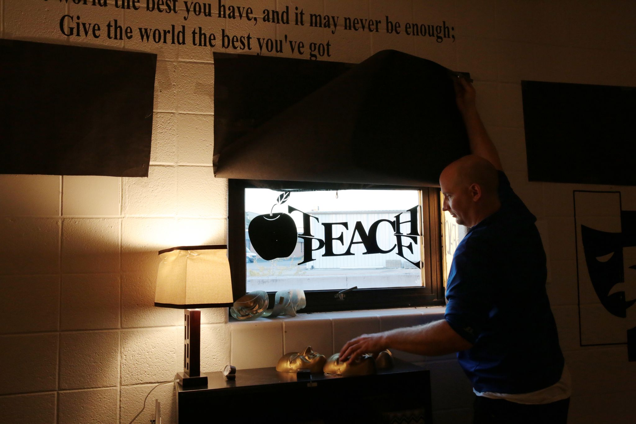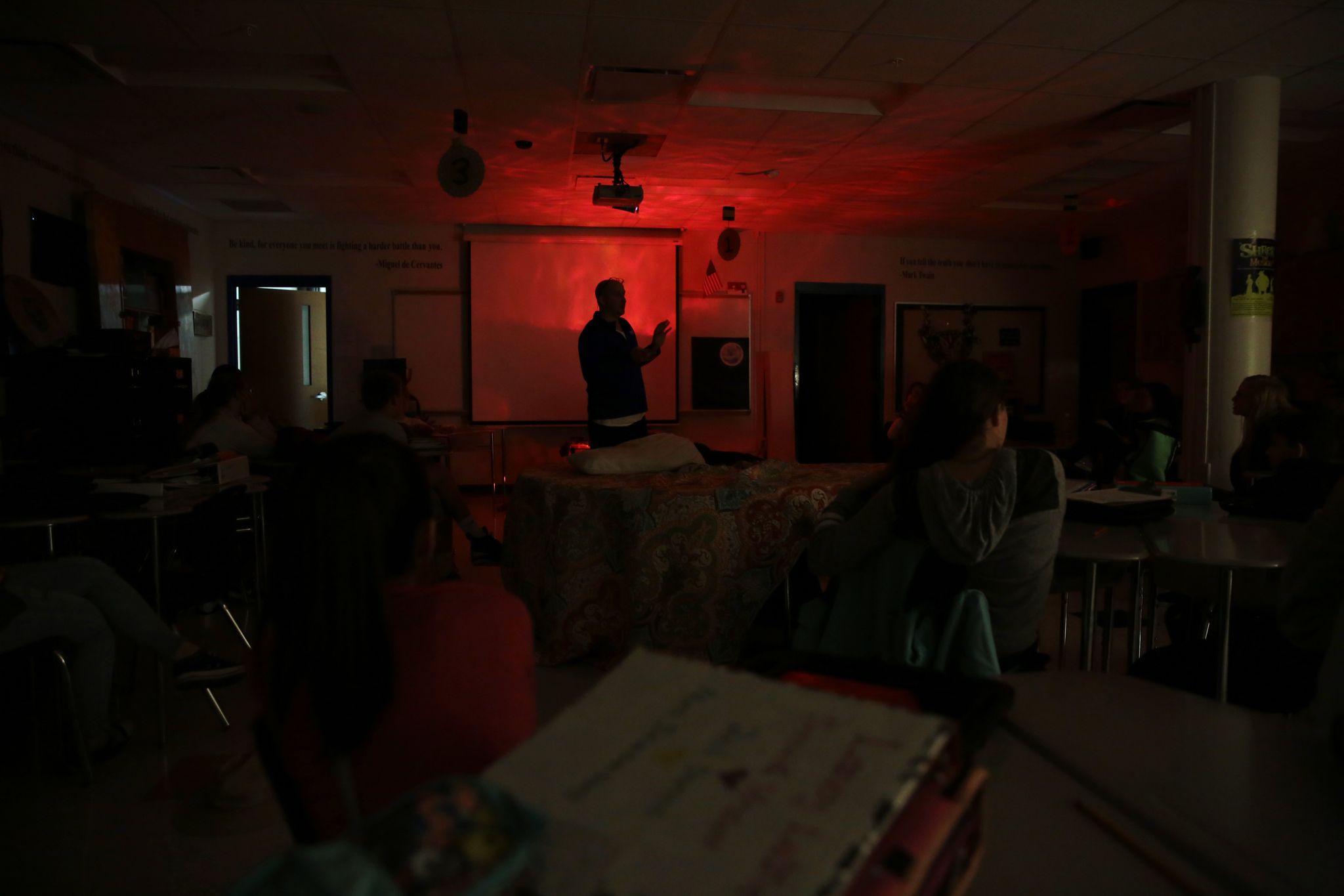 When you step into Adam’s classroom at the back of the school, the change in atmosphere is immediate. There are no florescent lights. In fact, there are no overhead lights on at all. Adam keeps the windows covered and uses lamplight sparingly to set the mood.