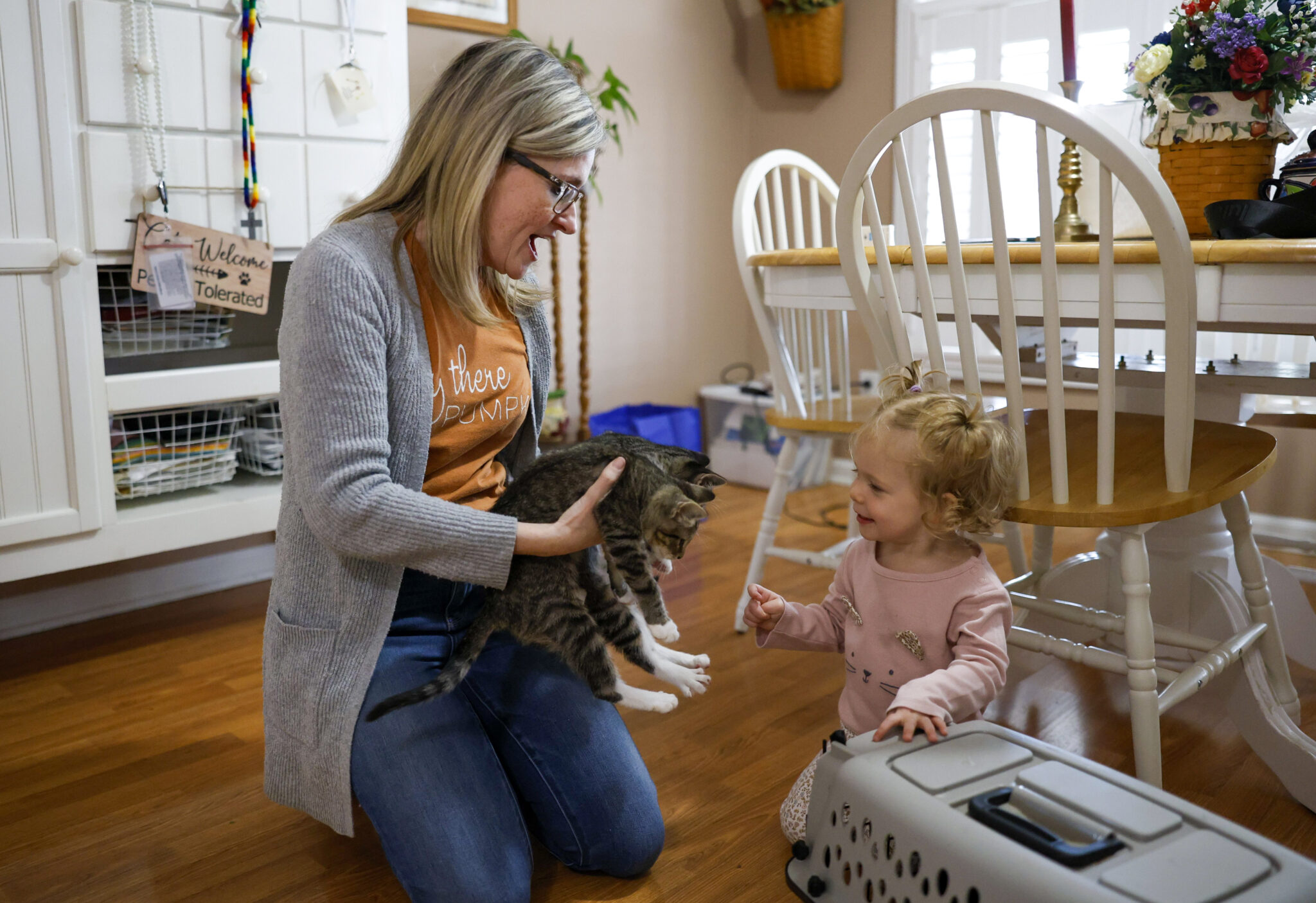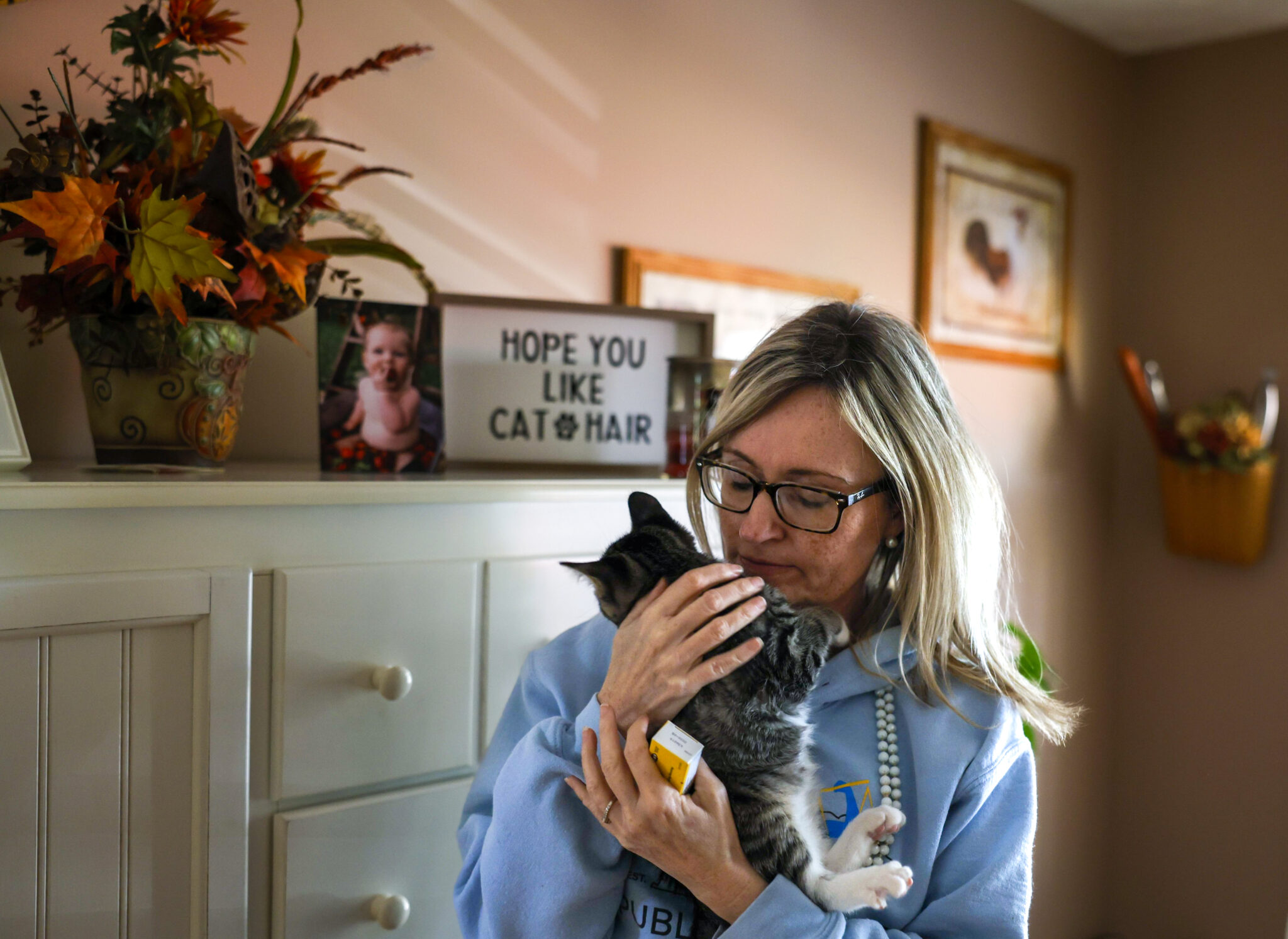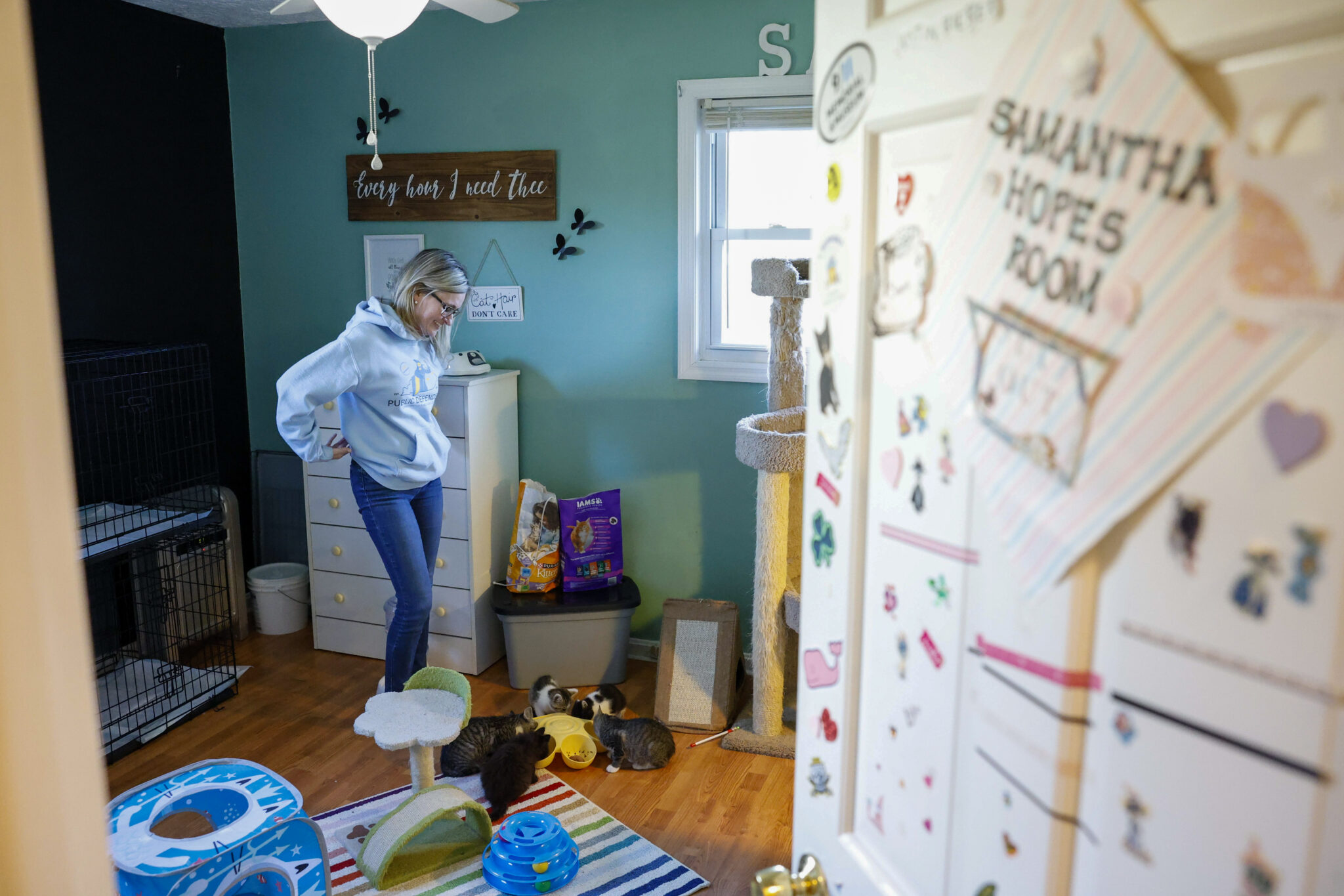 Now the room belongs to the cats, the ones Bridget, 51, rescues through Friends of Mason County & Surrounding Counties’ Animals, a small group she runs with her friend Karen Hopkins. Cat trees line the walls where posters used to hang. Litter boxes have replaced the toys that once covered the floor. Bridget hasn’t changed much else.