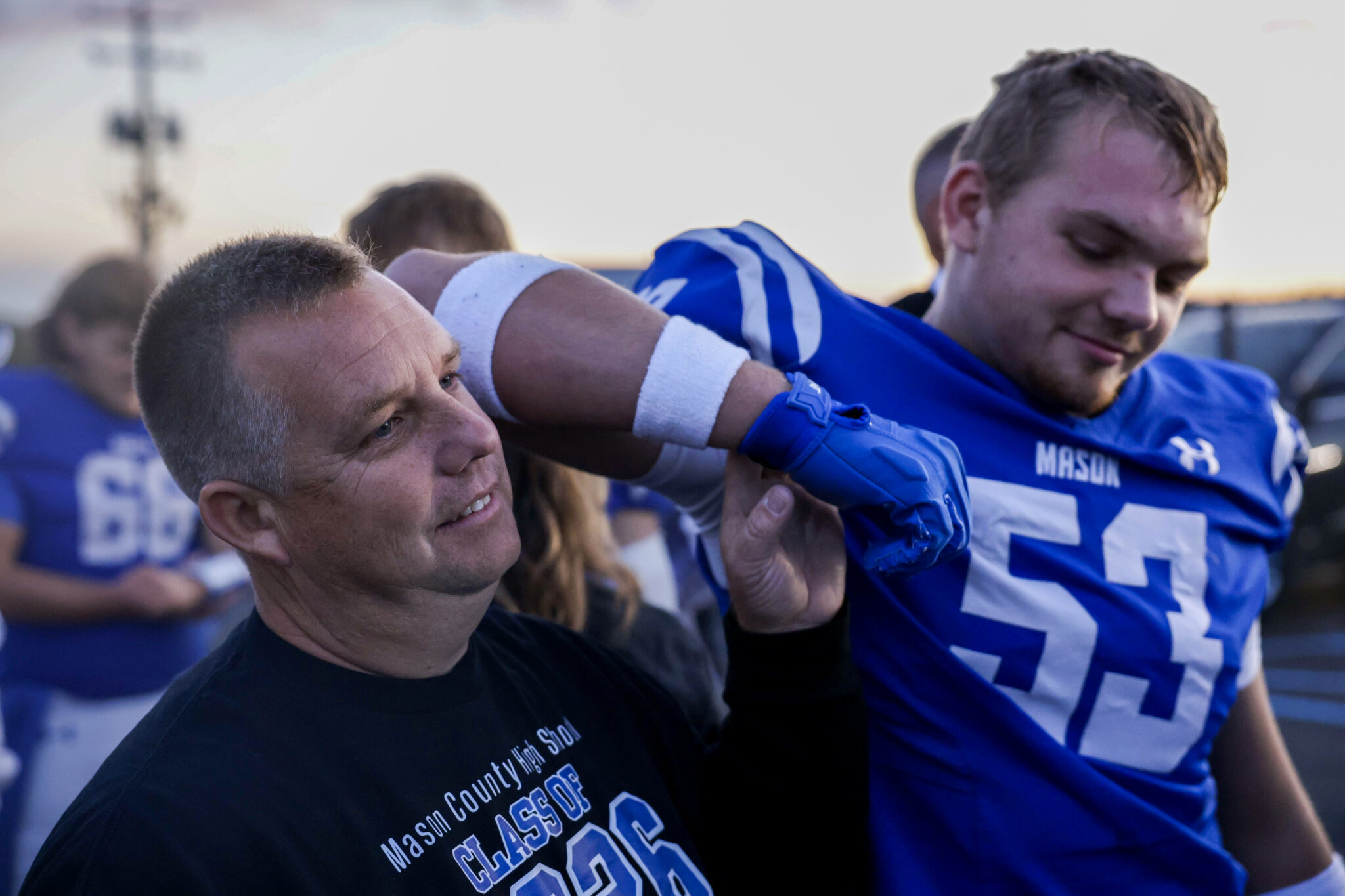 After a busy day, Lieutenant Paul Mellenkamp puts away his badge and uniform and replaces it with a royal blue T-shirt that reads “Mason County High School Class of 2026 Senior Dad.”