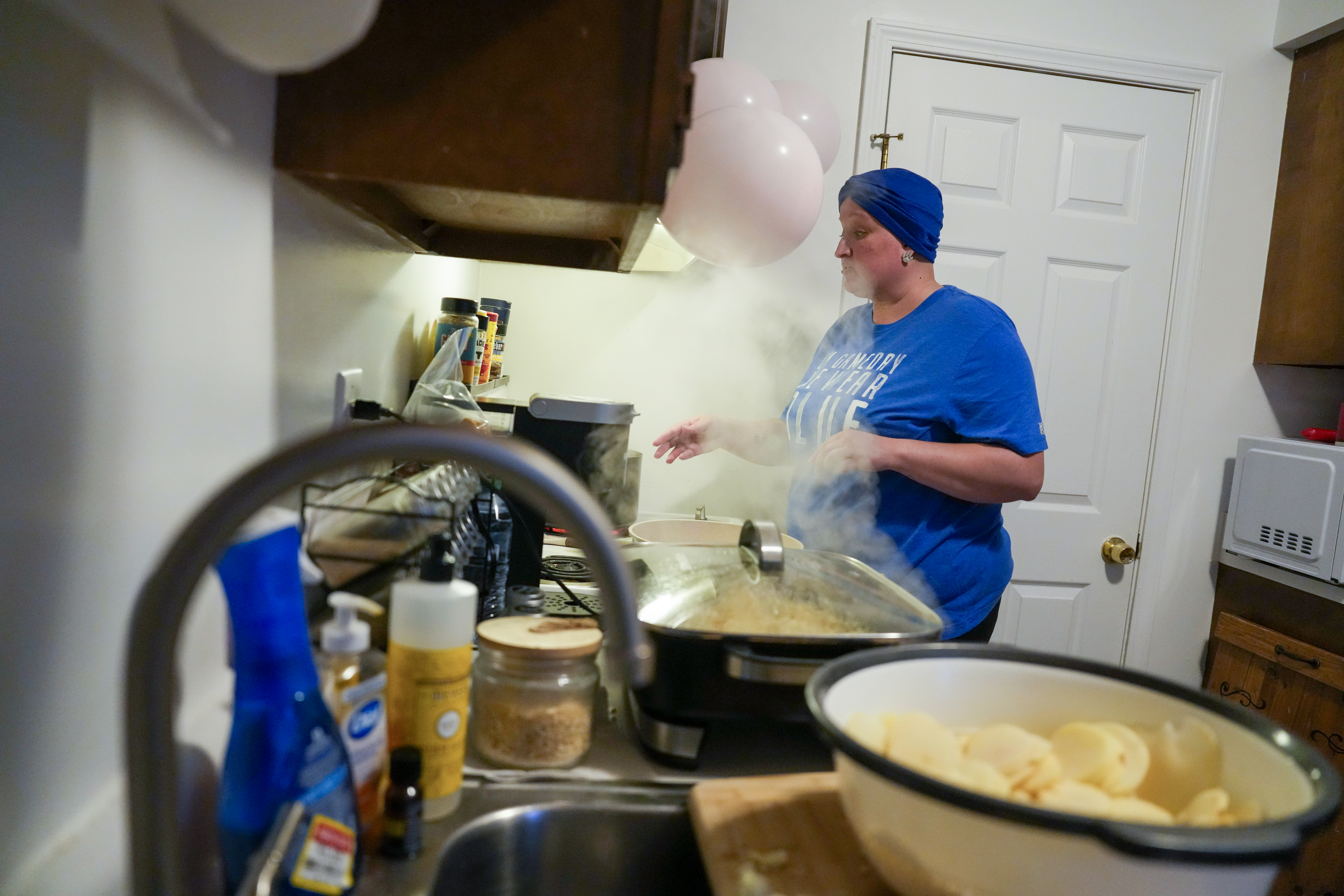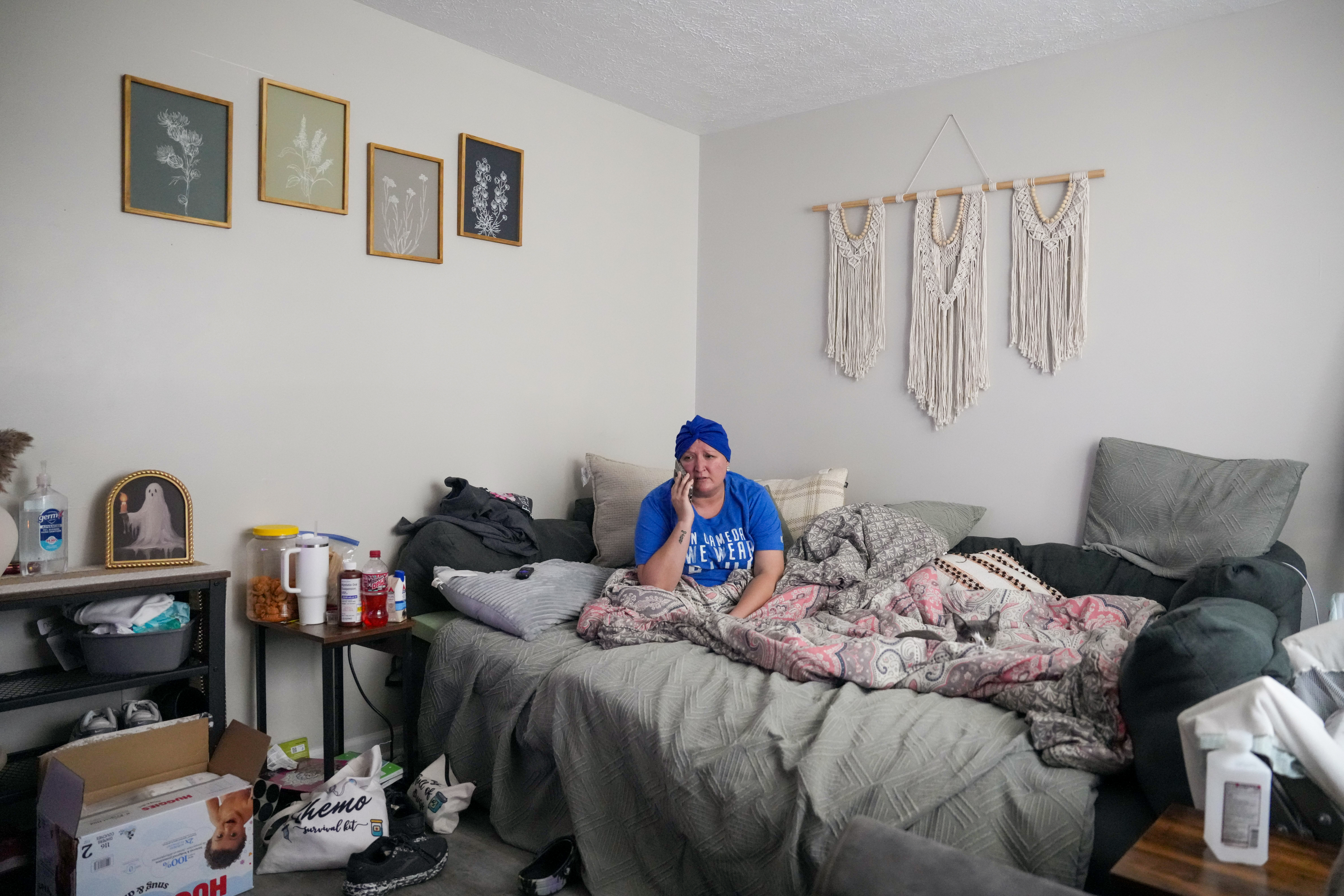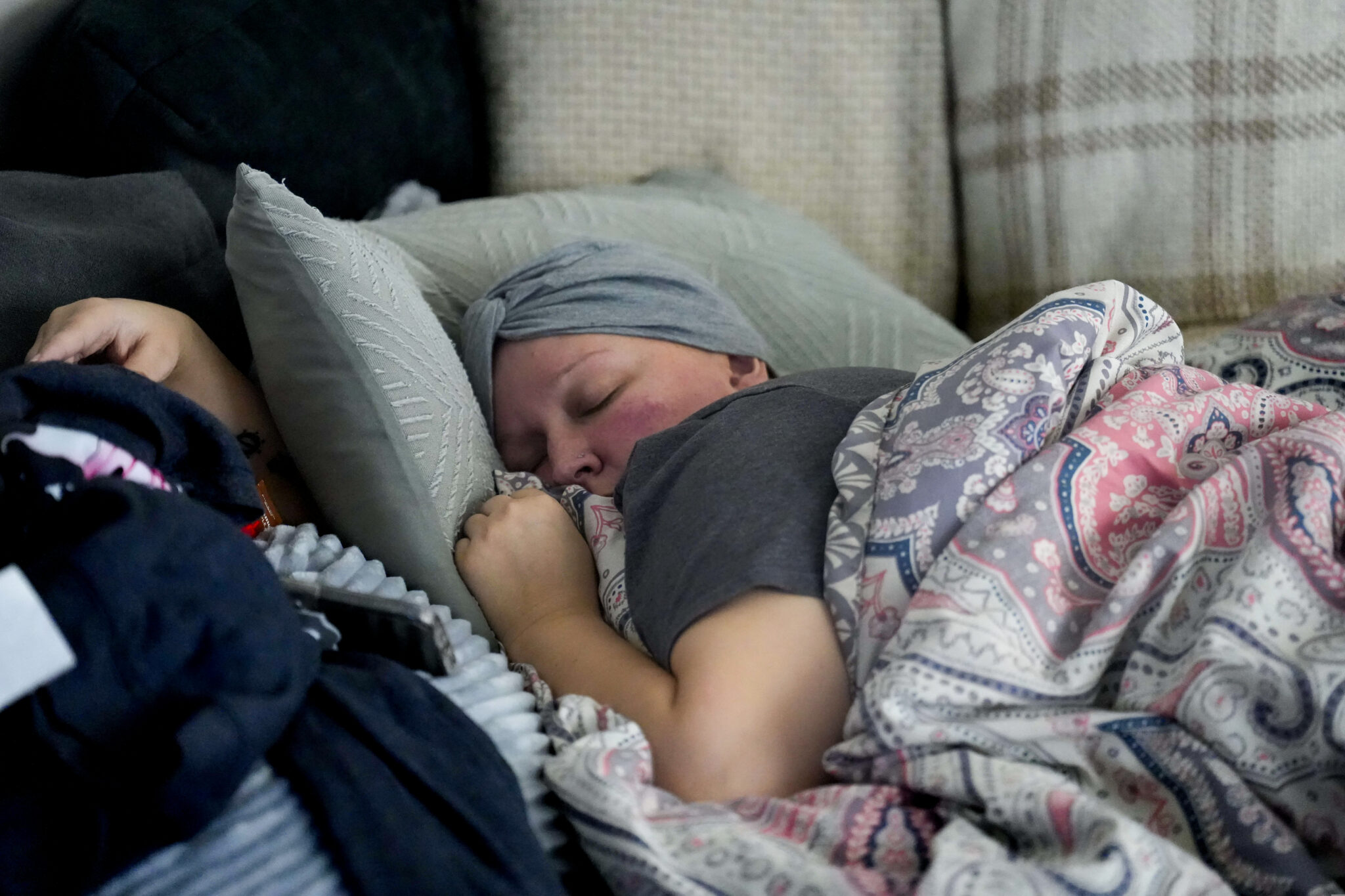 Even while living with cancer, Stacey often puts others’ needs ahead of her own. The head covering she wears makes her head hot, but Stacey leaves it on because her mother and daughter are not ready to see her newly bald head.